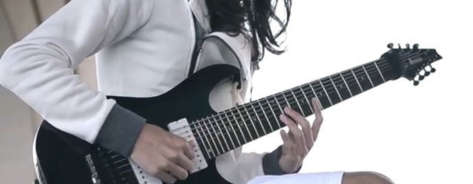 Zac Tiessen e una chitarra a otto corde con il suono pulito