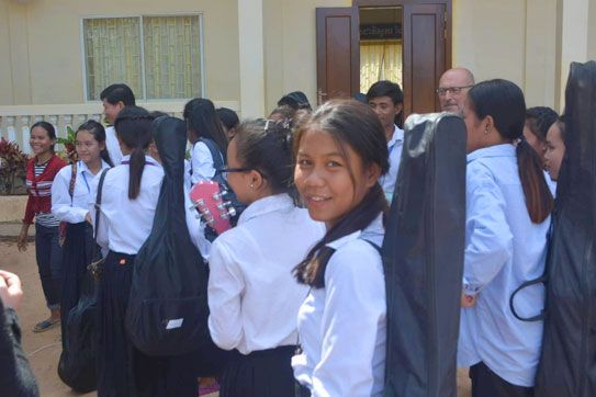 Gli allievi erano solo in parte quelli dell'anno scorso. «Ce n'erano che sono cresciuti e stanno diventando bravi. Per esempio c'era un chitarrista che sapeva già fare le parti solistiche, poi c'era qualcuno che aveva già cominciato col basso», dice Massimo. Il metodo è stato quello già collaudato: entrare in sintonia con i ragazzi con una selezione delle hit pop cambogiane dall'armonia semplice (il giro di do è universale...) e costruire con esse un repertorio da eseguire dal vivo nel corso di un grande spettacolo finale di fronte che coinvolge tutta la scuola, «con le solite 40 chitarre d'accompagnamento ma anche con la band».